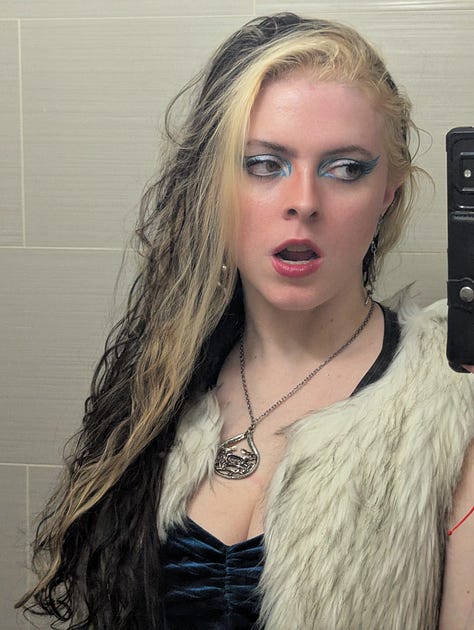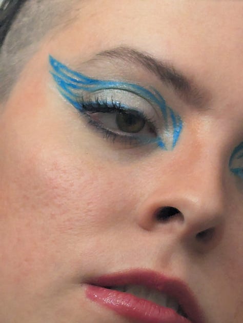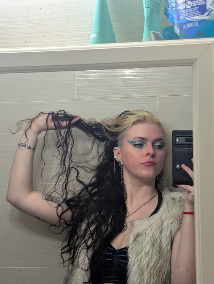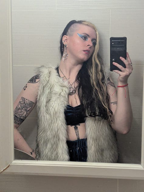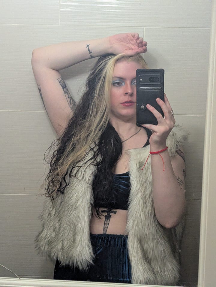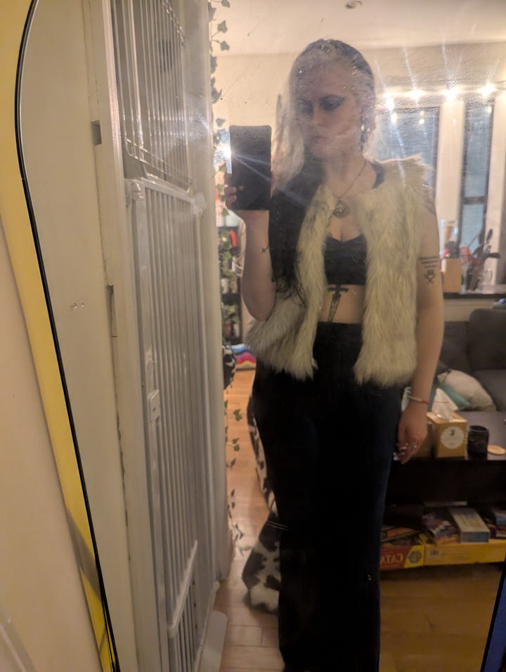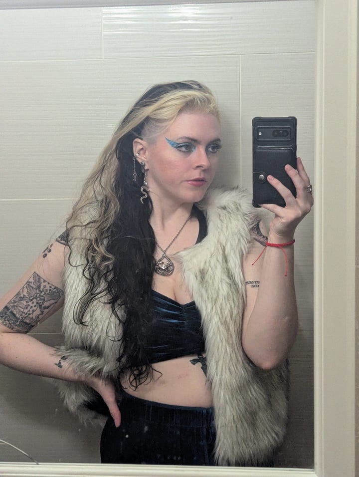 This day was also my roommate Kristen’s birthday, so we celebrated them at their tattoo studio, Lucky Dog in East Harlem! The look for that night included my blue velvet set, my faux fur vest, my grandmother’s crab necklace, and a graphic eye liner look achieved with silver and blue tones