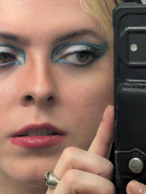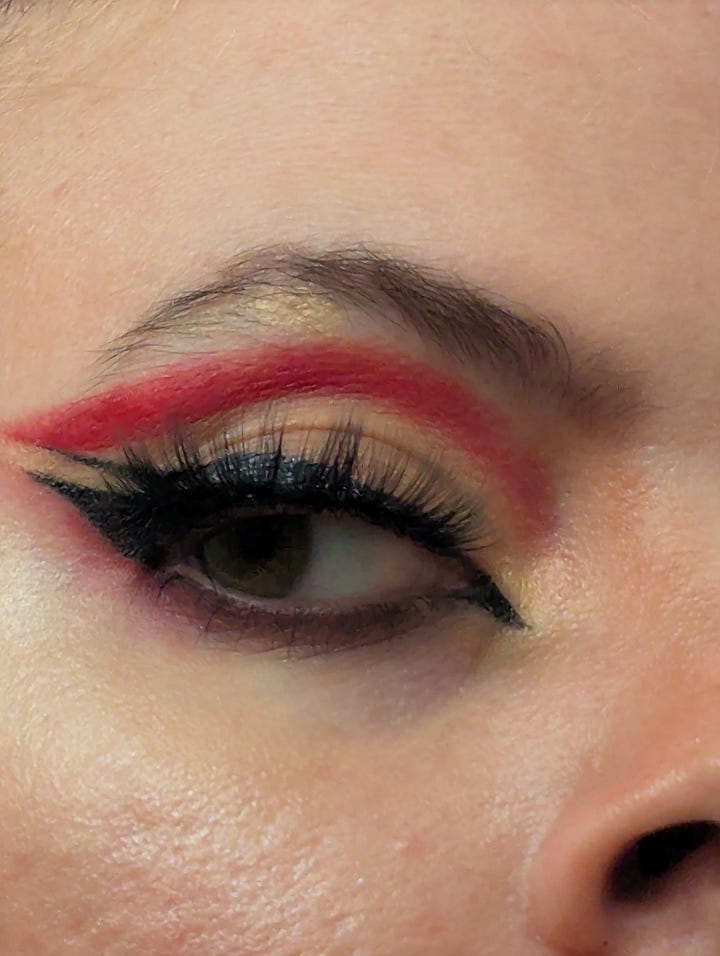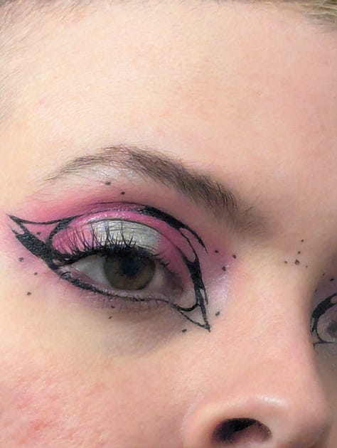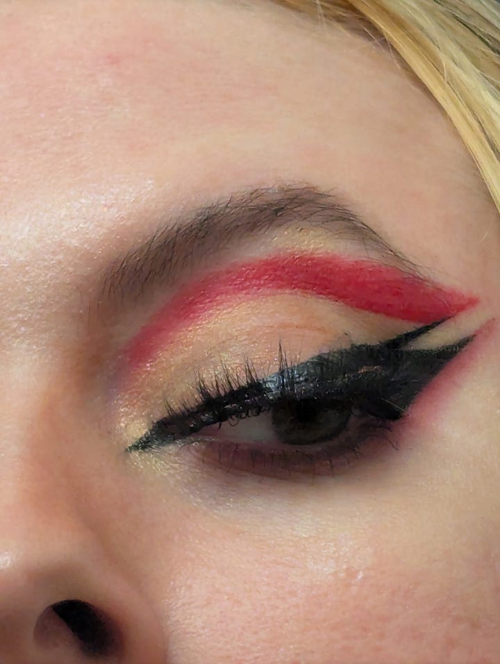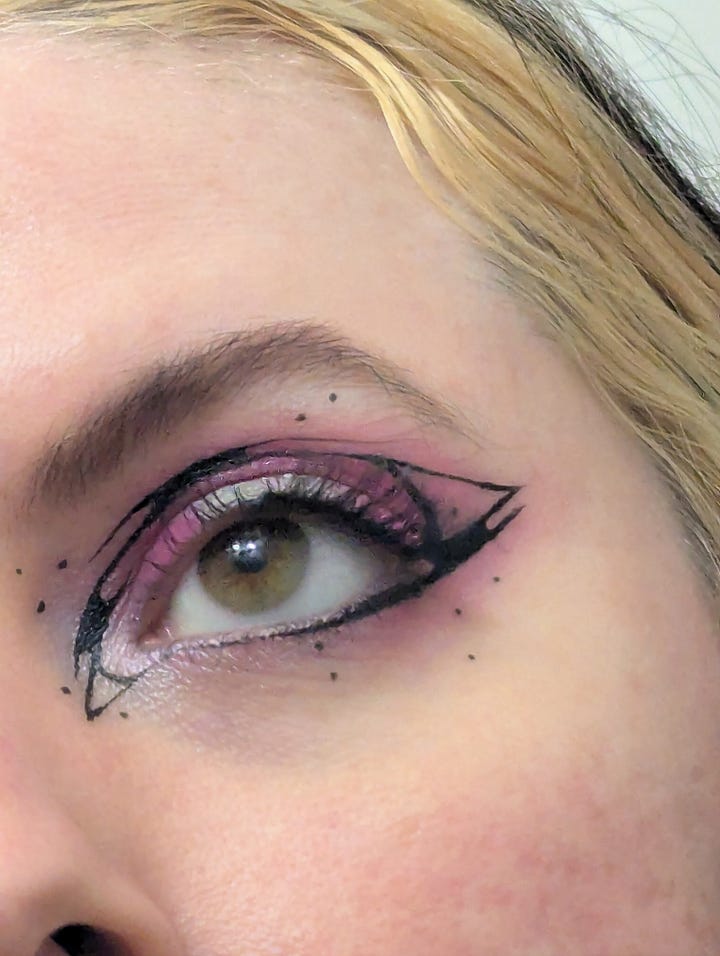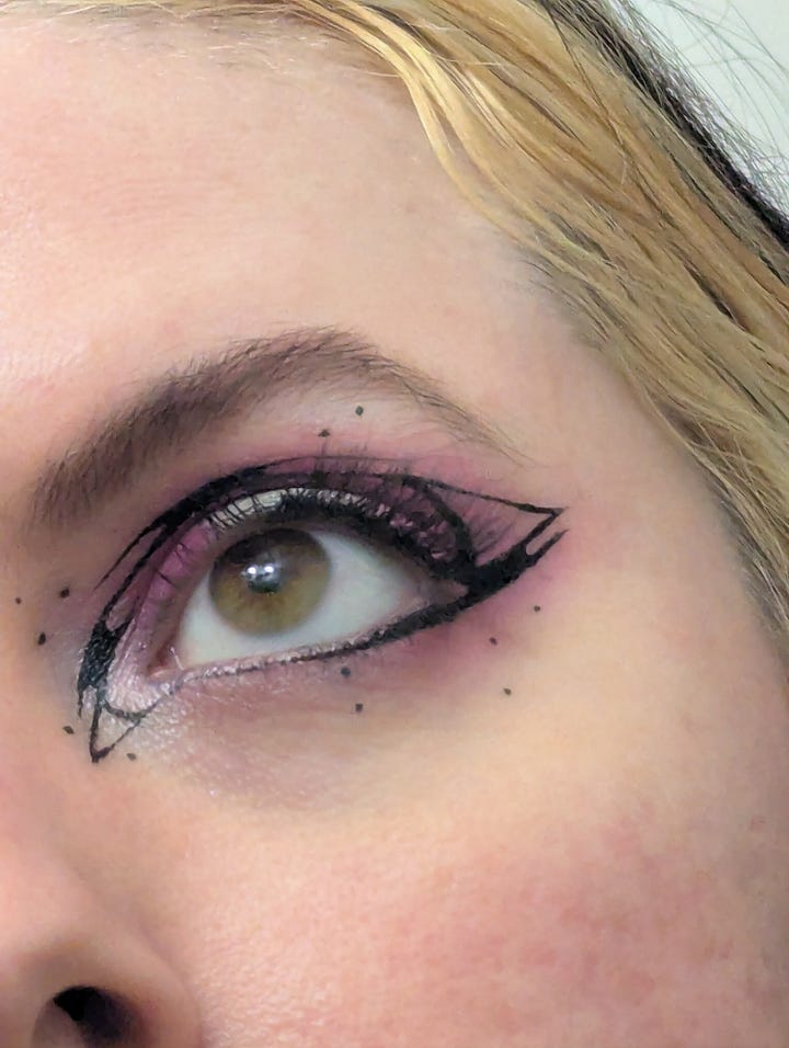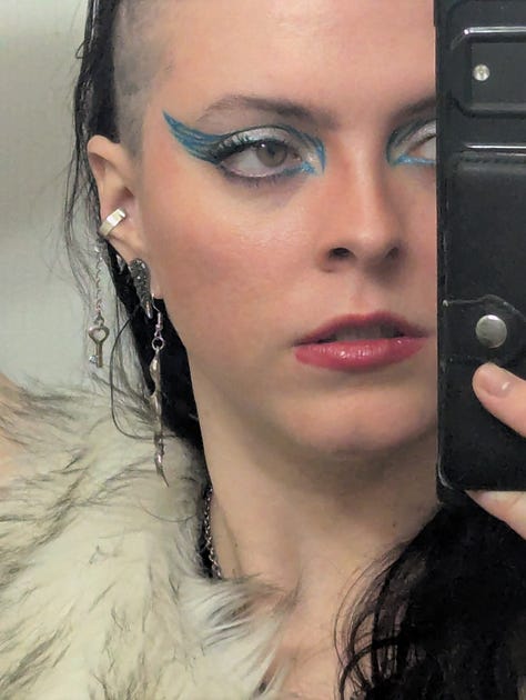 This day was also my roommate Kristen’s birthday, so we celebrated them at their tattoo studio, Lucky Dog in East Harlem! The look for that night included my blue velvet set, my faux fur vest, my grandmother’s crab necklace, and a graphic eye liner look achieved with silver and blue tones