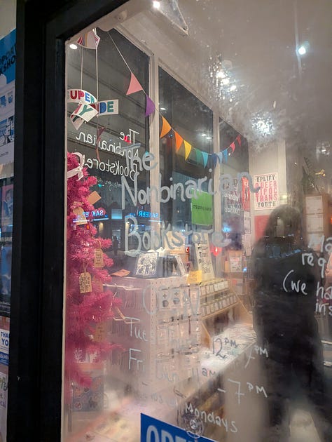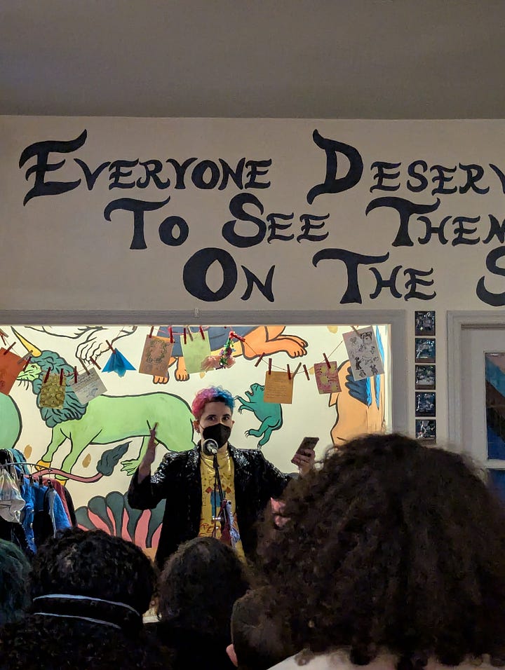 The following Thursday, Tre and I attended a queer open mic at The NonBinarian Bookstore in Brooklyn! The open mic was hosted by L’or, and the event is called Intimate Fragments. This one’s theme was smut, so I read a sexy poem or five when I was called to read, and shamelessly plugged my subs