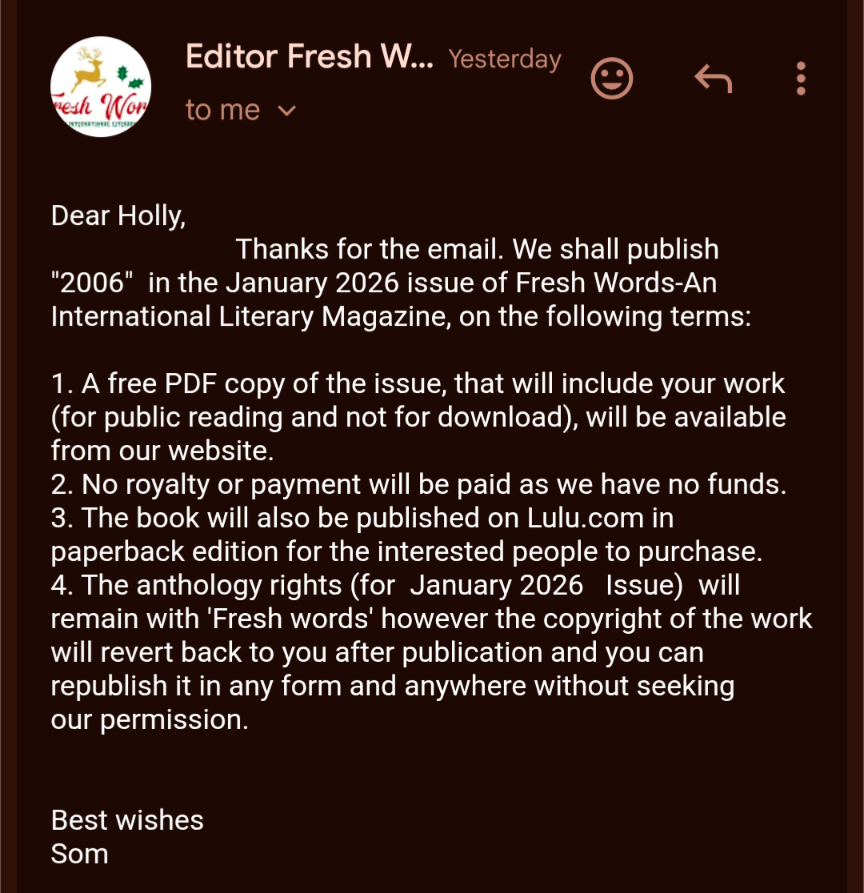 Which was then selected to be published in Fresh Words International Literary Magazine! My work is overseas :’)