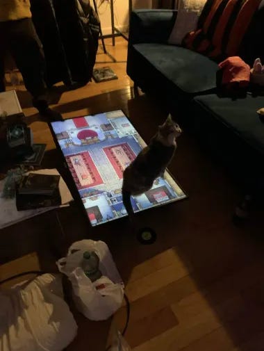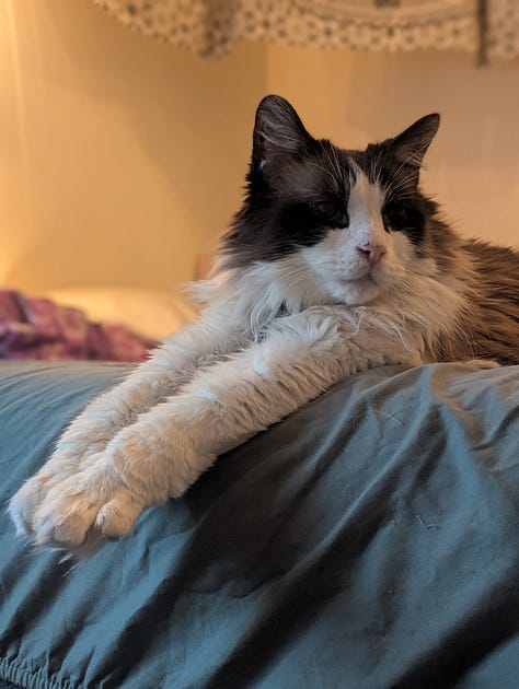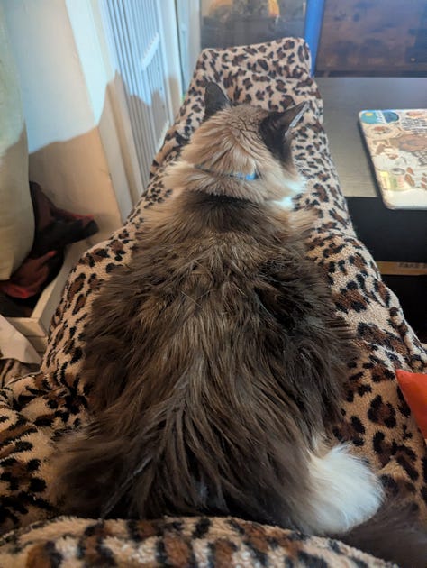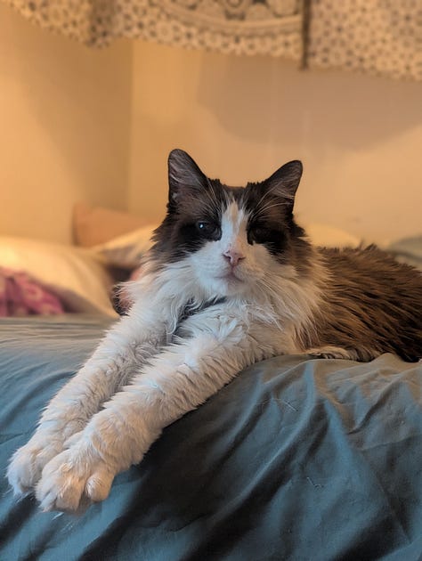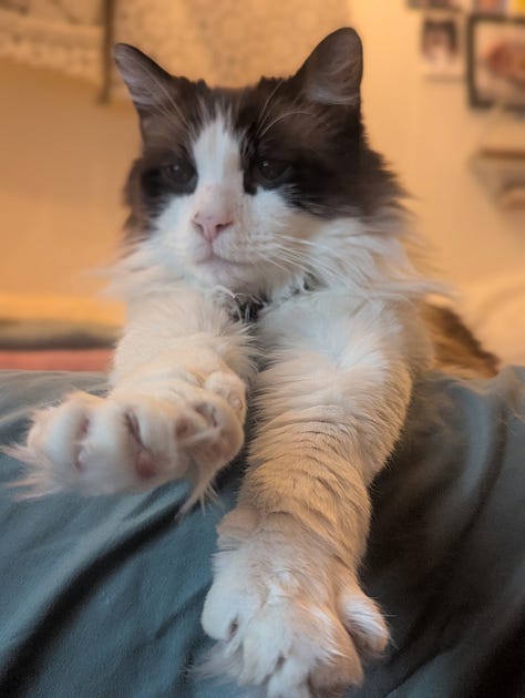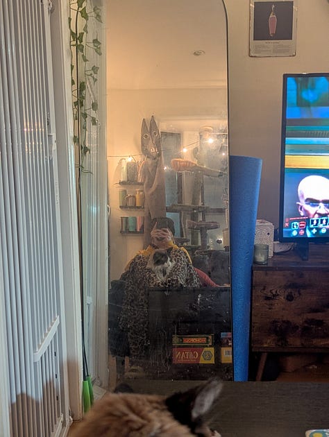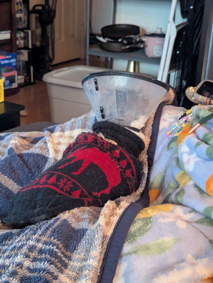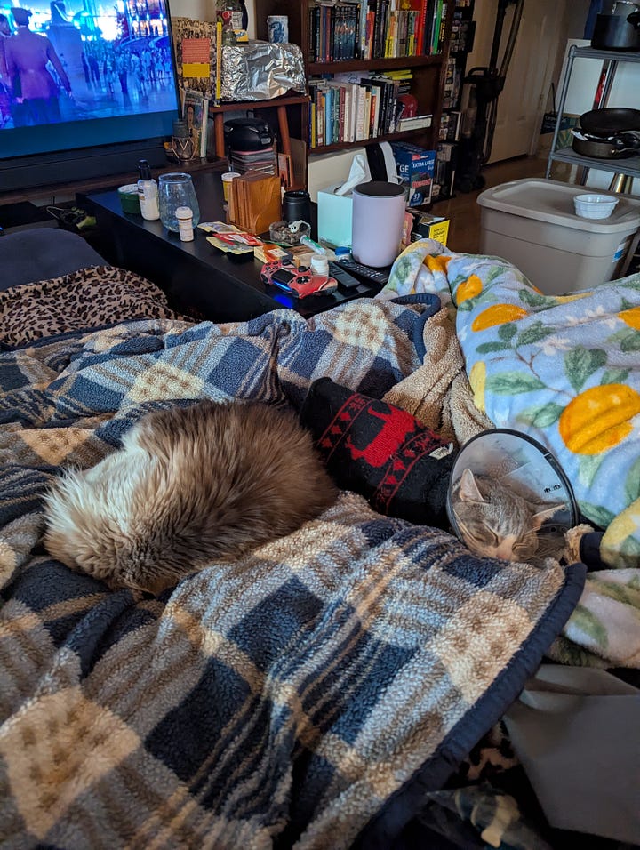 Stripes got neutered! His recovery has been going well, though he’s much more subdued in the cone. We got a rare moment where Stripes settled in Tre’s lap and cuddled Walter, two firsts that happened within an hour of each other lol
