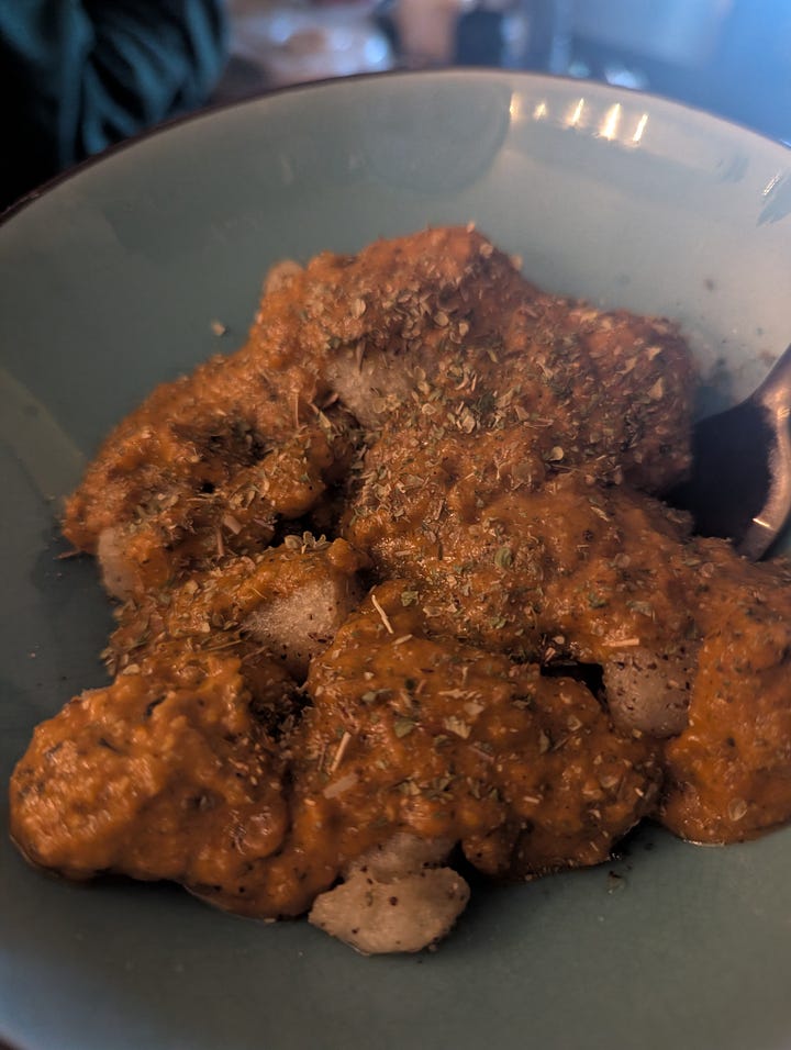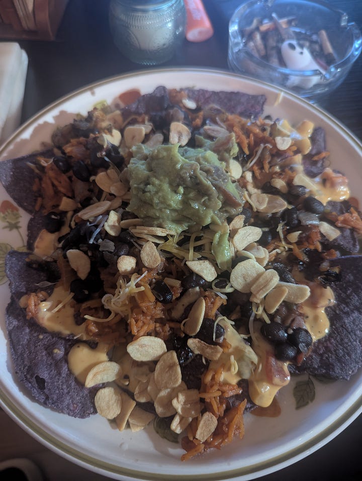 cauliflower gnocchi with a red sauce, then veggie nachos with all the fixin’s